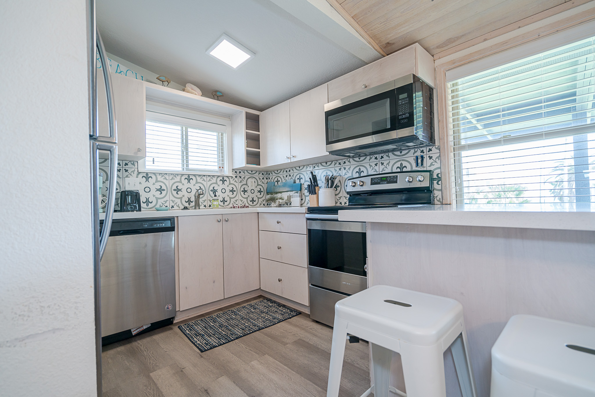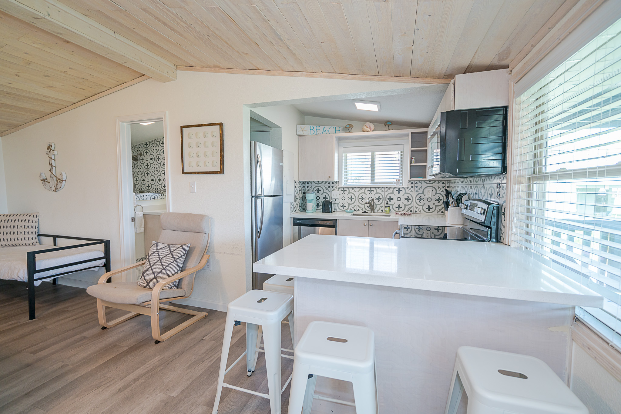 The fully equipped kitchen with stainless steel appliances has ample space to create vacation meals, with counter top seating for four—perfect for casual snacking and dining. A comfy couch and a four-seat round table provide just the right setting for family movie nights and card games that last into the wee hours.