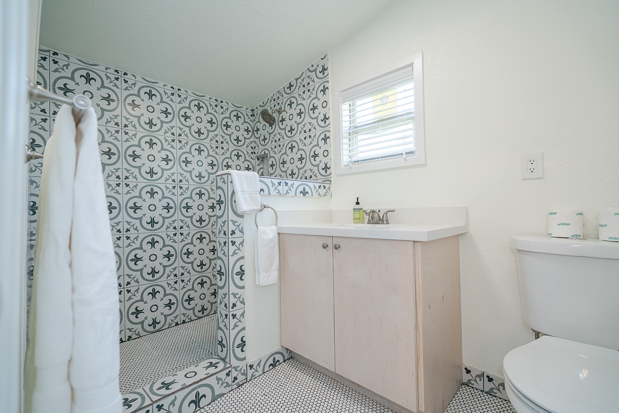 The winning combination of large, decorative wall tile and dot-tile flooring make for a bathroom that wows. A gorgeous one-of-a-kind walk-in shower is the focal point of the newly upgraded space.